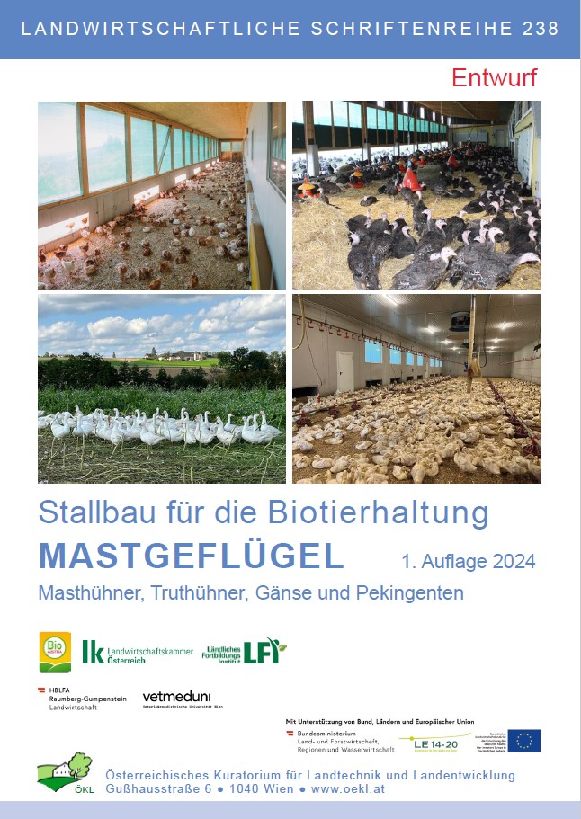 Detaillierte Informationen zum Thema Stallbau im Biogeflügelbereich sind des Weiteren in den druckfrischen ÖKL-Broschüren “Stallbau für die Biotierhaltung – Legehennen“ sowie “Stallbau für die Biotierhaltung – Mastgeflügel“ zu finden. Diese Broschüren können in Kürze beim Österreichischen Kuratorium für Landtechnik und Landentwicklung, kurz ÖKL, unter oder 01/5051891 bestellt werden.