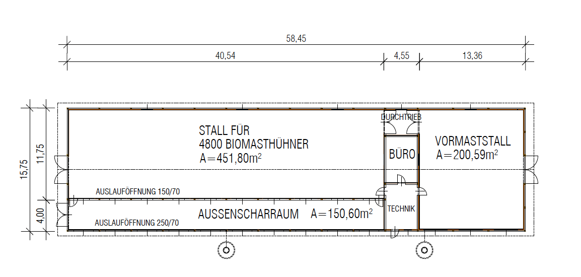 Da die Veranda in der alten EU-Bio-Verordnung nicht geregelt war, waren die Anforderungen für Auslauföffnungen ebenfalls nur für den Übergang vom Stall in den Grünauslauf geregelt. Die Forderung lautete, dass Ein- und Ausflugklappen einer den Tieren angemessenen Größe vorhanden sein müssen, deren Länge zusammengerechnet mindestens 4m je 100m² der den Tieren zur Verfügung stehenden Stallfläche entsprach. Aufgrund der Berücksichtigung von Haltungssystemen, die zusätzlich zum Stallgebäude auch über Veranden verfügen, müssen nun folgende Vorgaben eingehalten werden: die Länge der Ein- und Ausflugklappen zwischen dem Innenbereich und der Veranda muss zusammengerechnet mindestens 2 m je 100 m² der nutzbaren Fläche der Mindeststallfläche bzw. zwischen der Veranda oder Stall zum Freigelände hin muss zusammengerechnet mindestens 4 m je 100 m2 der nutzbaren Fläche der Mindeststallfläche entsprechen. Diese Vorgabe erscheint auf dem ersten Blick als eine Erleichterung. Allerdings bedeutet diese Anforderung für jene Betriebe, die ihren Außenscharrraum in Zukunft als Stallfläche (K2) nutzen wollen, dass zusätzliche Auslauföffnungen angeboten werden müssen. Der Grund dafür liegt darin, dass die Gesamtlänge der Ausflugklappen mit der den Tieren zur Verfügung stehenden Stallfläche korreliert. Wenn nun die Stallfläche sich zB. von 400 m² (Stallsystem mit 400 m² Stallinnenraum und 150 m² ASR) auf 550 m² (Stallsystem mit 400 m² K1 und 150 m² K2) vergrößert, muss auch die Länge der Auslauföffnungen in den Grünauslauf statt 18 lfm in Zukunft 22 lfm betragen. Je nach Bauausführung am Betrieb ist damit unterschiedlich hoher Aufwand verbunden.