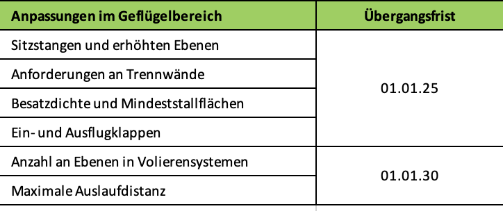 Um die neuen Regelungen in der Praxis leichter umzusetzen und den betroffenen Geflügelhaltern entsprechend Zeit zu geben, die erforderlichen Anpassungen vorzunehmen, wurden seitens der EU-Bio-Verordnung entsprechende, für bestehende Haltungsanlagen mit einer Inbetriebnahme vor 1.1.2022 zum Teil unterschiedliche Übergangsfristen in Artikel 26 der Durchführungsbestimmungen (EU) 2020/464 bzw. in Artikel 1 der Durchführungsverordnung (EU) 2020/2042 festgesetzt. Haltungssysteme, welche nach dem 1.1.2022 in Betrieb genommen wurden, mussten die neuen Anforderungen von Anfang an umsetzen. Einen Überblick über die Neuerungen und die dazugehörigen Fristen für bestehende Produktionseinheiten gibt folgende Tabelle wider:
