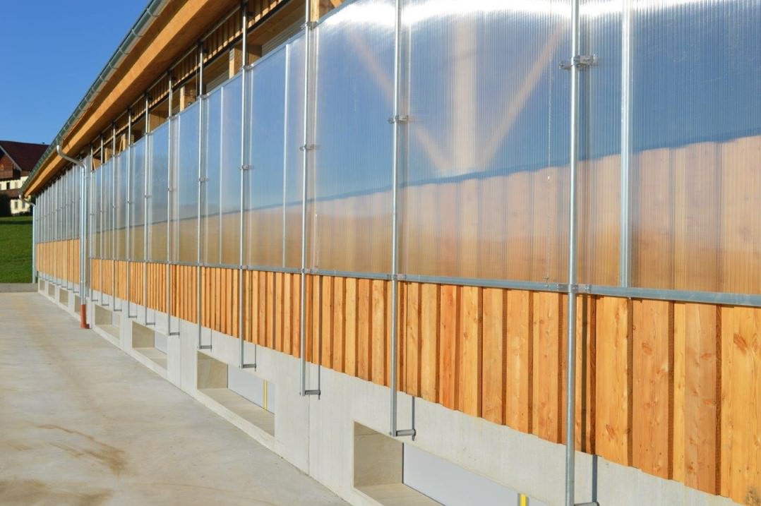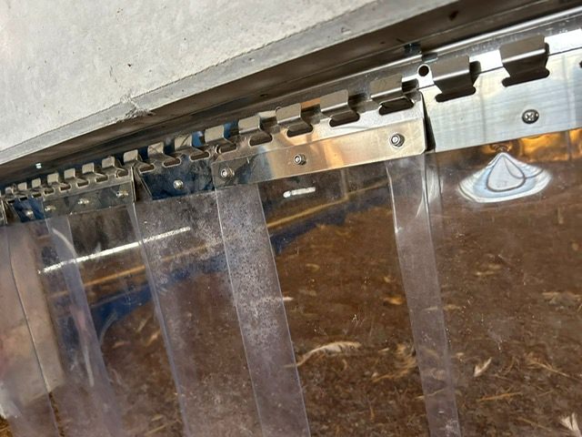 von li nach re: Streifenvorhänge reduzieren Zugluft im Stallinneren. Das Anbringen von Doppelstegplatten wirkt in der kalten Jahreszeit isolierend. Die Klimazone 2 muss in der letzten Mastphase ständig zugänglich sein.