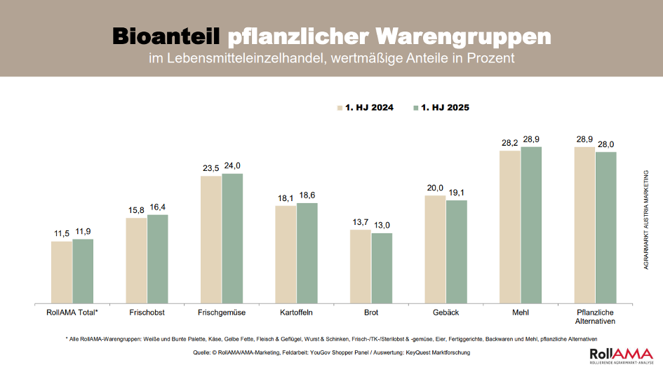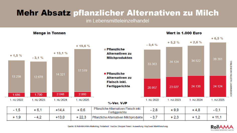 Absatz pflanzlicher Alternativen und Bioanteil pflanzlicher Warengruppen – RollAMA 1. Halbjahr 2025