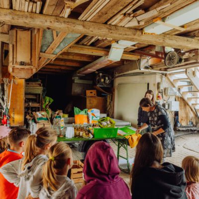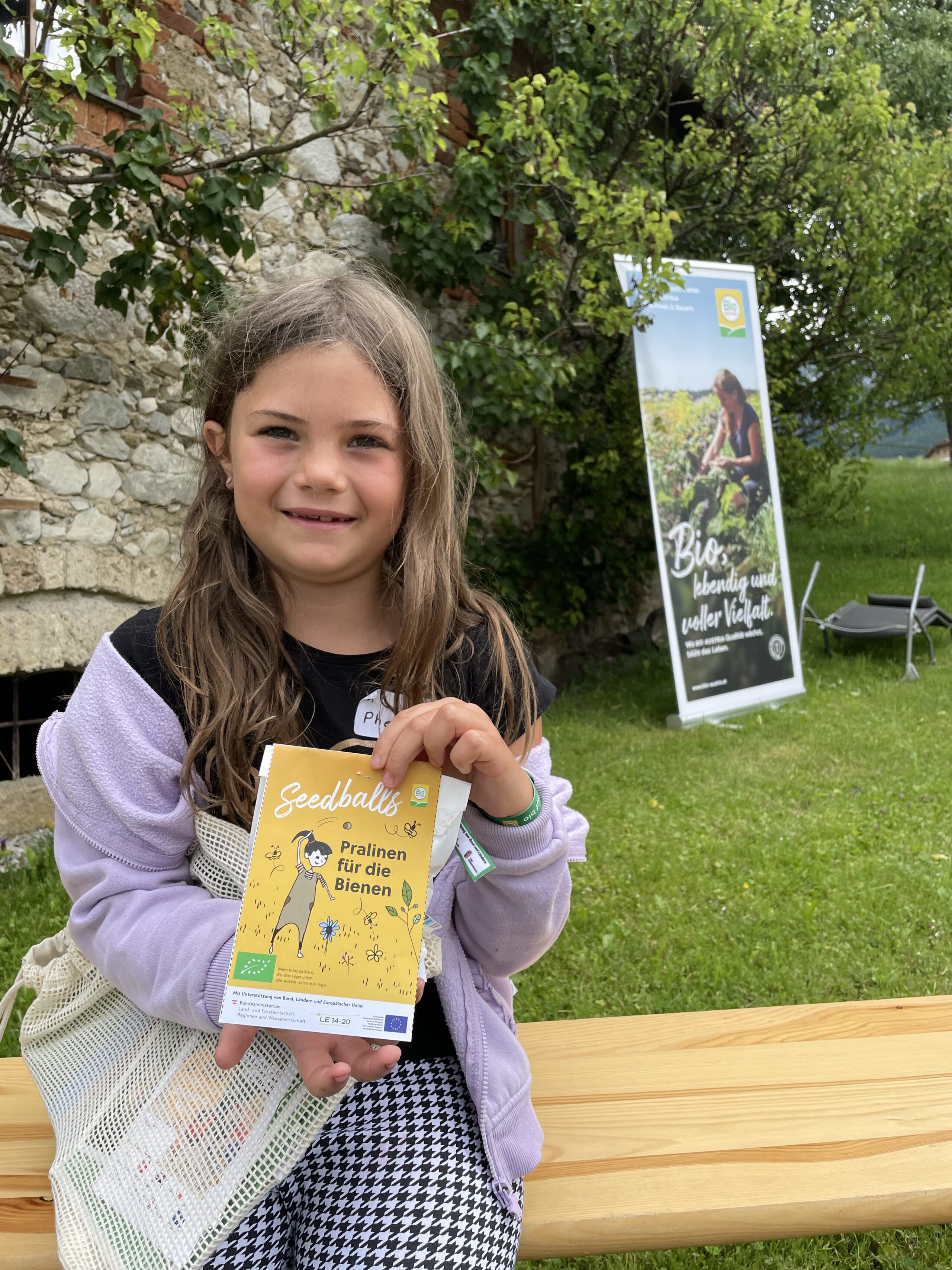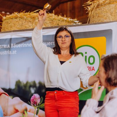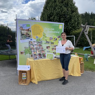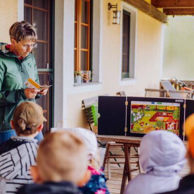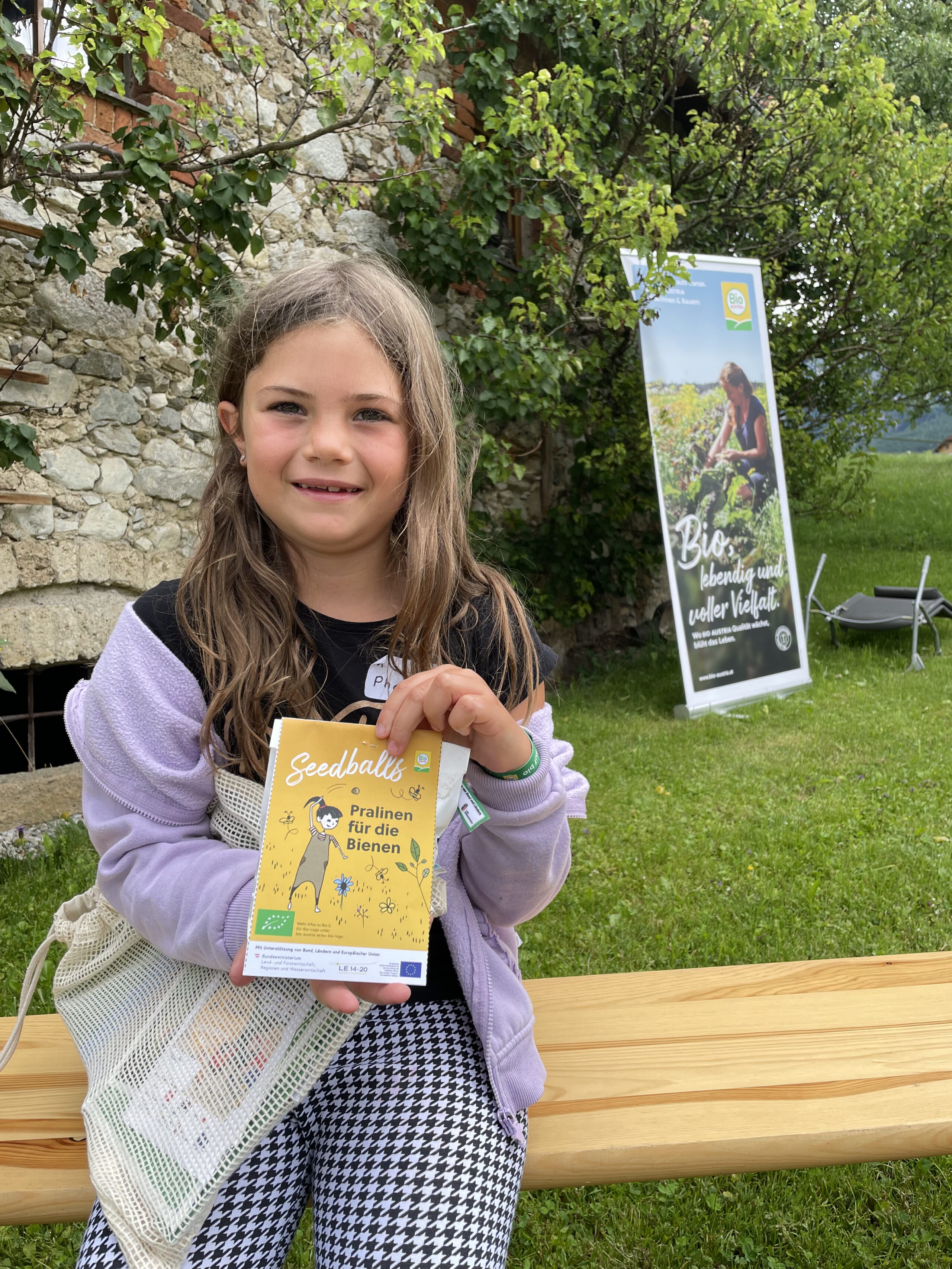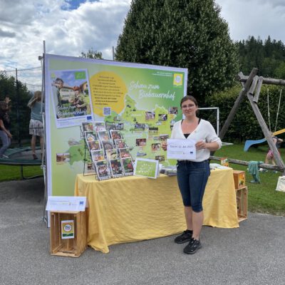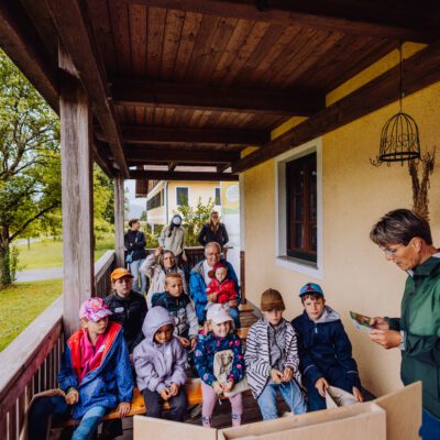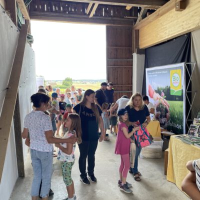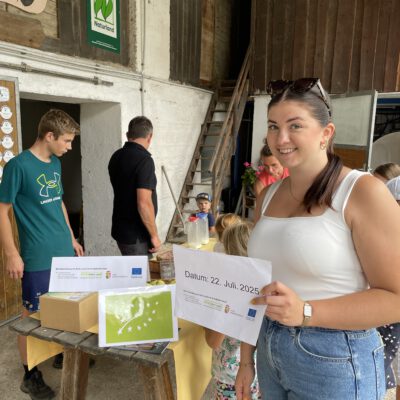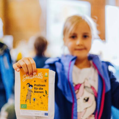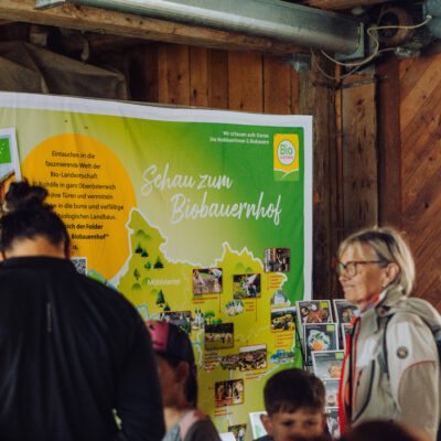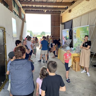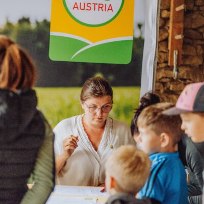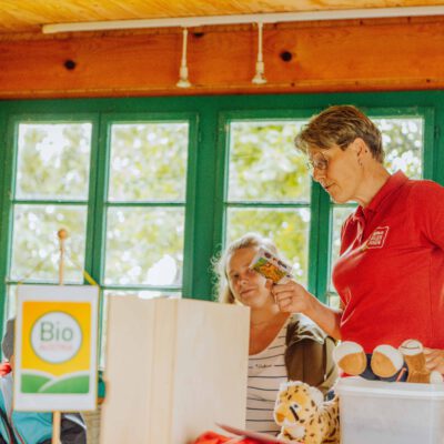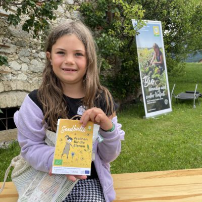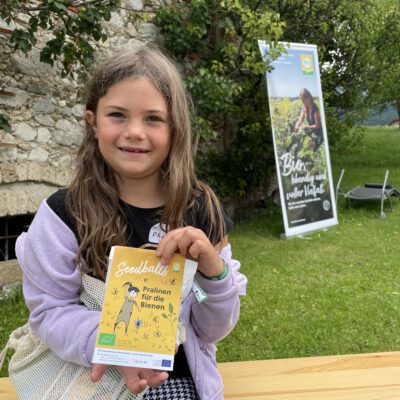 Ein besonderes Highlight waren die vier liebevoll gestalteten Mitmach-Stationen, die auf jedem Biohof für ein abwechslungsreiches und kindgerechtes Erlebnis sorgten. Beim Mira & Maxi-Erzähltheater wurde die Geschichte aus dem Bilderbuch „Mira und Maxi am Bio-Bauernhof“ im „Holzfernseher“ lebendig – begleitet von einer Bio-Seminarbäuerin und interaktiv erzählt. Bei einer weiteren Station drehte sich alles um das Thema Biodiversität. Mit tasten in „Greifsäcken“ und dem Formen von Samenbällen oder auch liebevoll „Pralinen für die Bienen“ genannt, wurde das Thema anschaulich vermittelt.