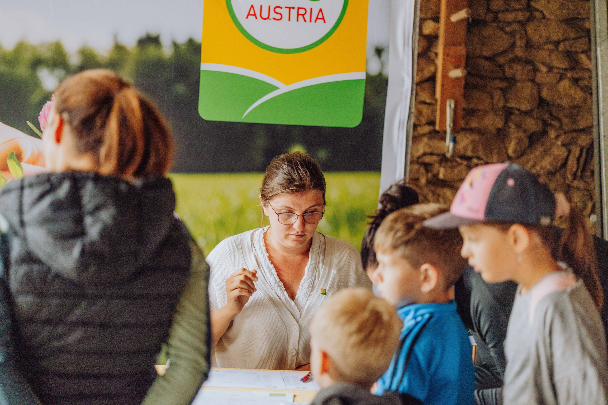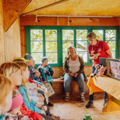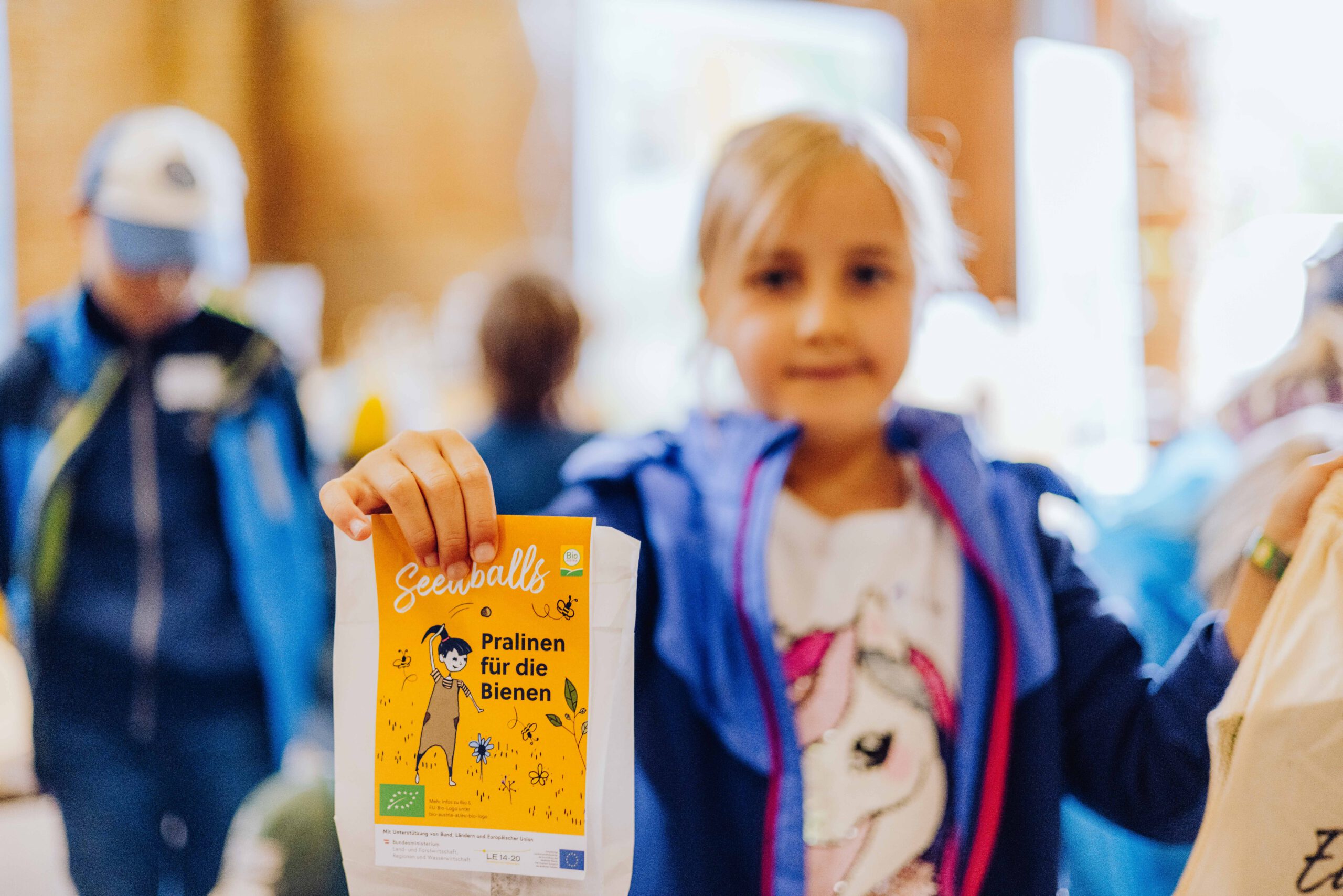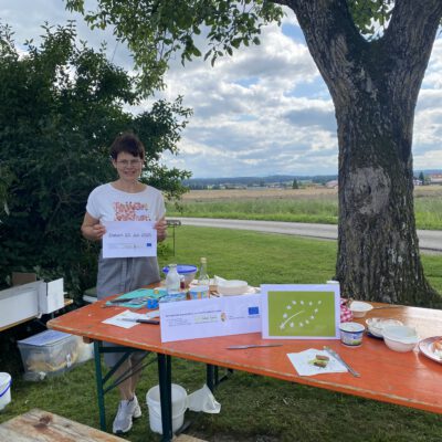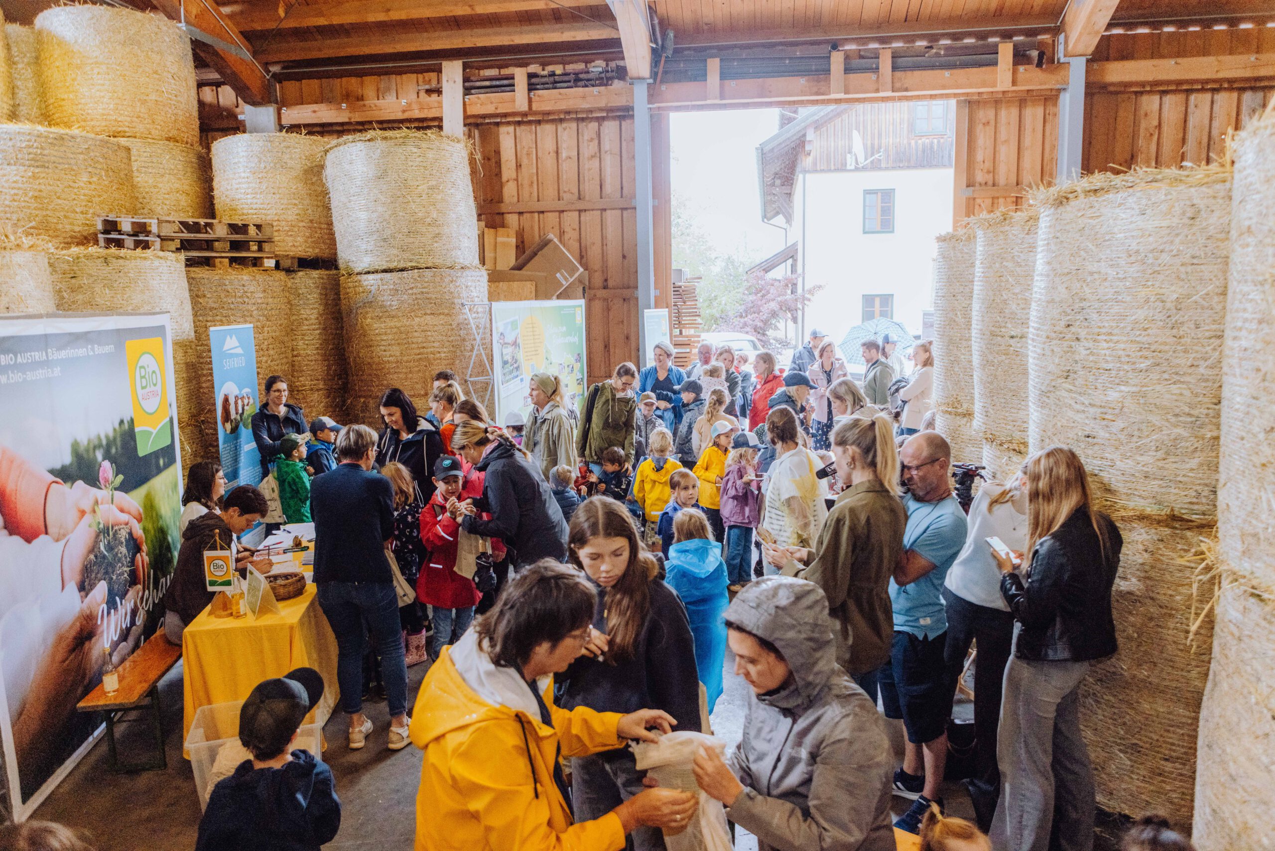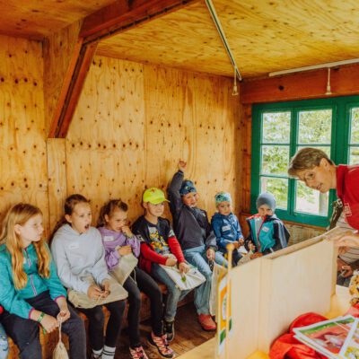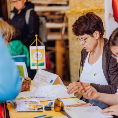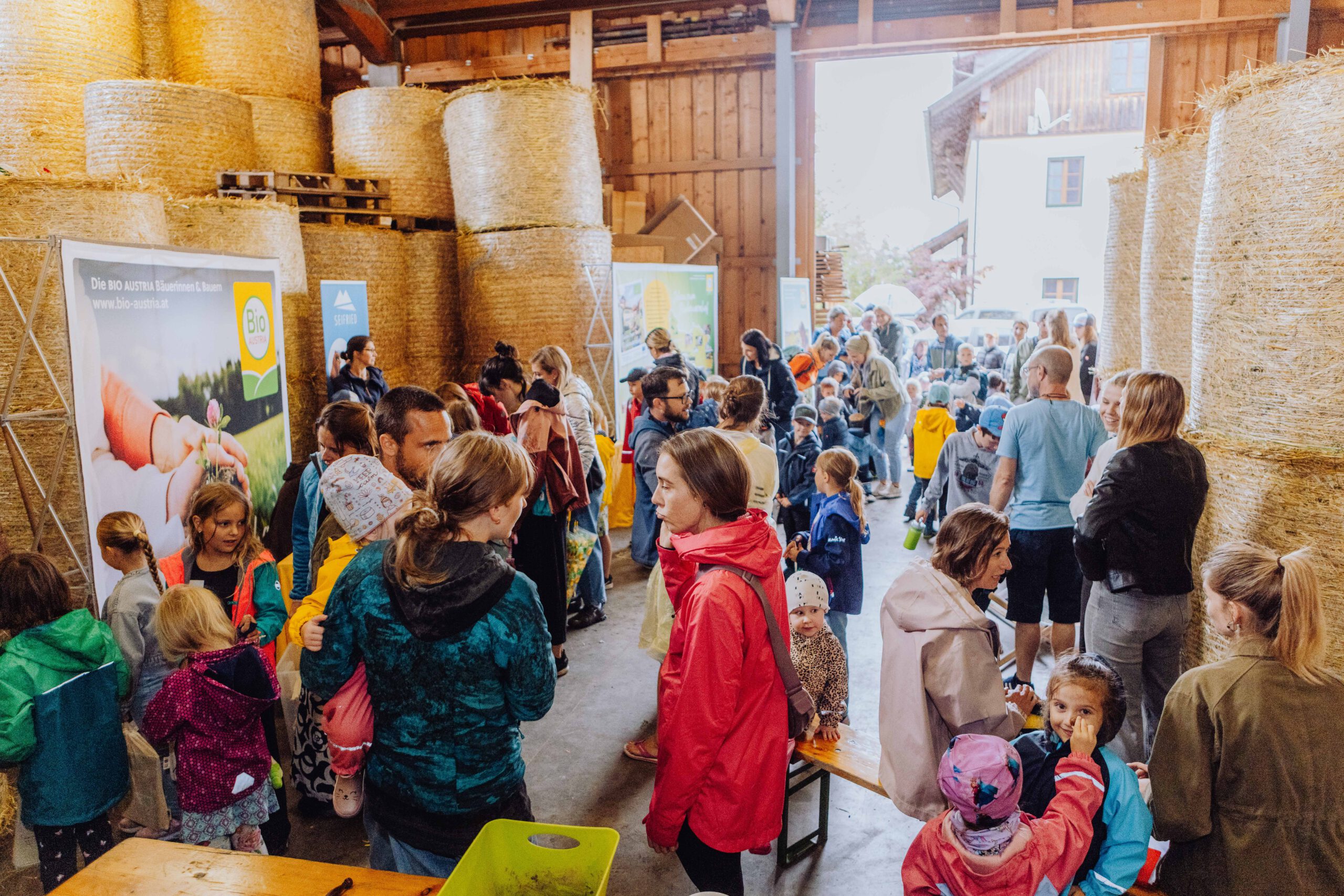 Ein besonderes Highlight waren die vier liebevoll gestalteten Mitmach-Stationen, die auf jedem Biohof für ein abwechslungsreiches und kindgerechtes Erlebnis sorgten. Beim Mira & Maxi-Erzähltheater wurde die Geschichte aus dem Bilderbuch „Mira und Maxi am Bio-Bauernhof“ im „Holzfernseher“ lebendig – begleitet von einer Bio-Seminarbäuerin und interaktiv erzählt. Bei einer weiteren Station drehte sich alles um das Thema Biodiversität. Mit tasten in „Greifsäcken“ und dem Formen von Samenbällen oder auch liebevoll „Pralinen für die Bienen“ genannt, wurde das Thema anschaulich vermittelt.