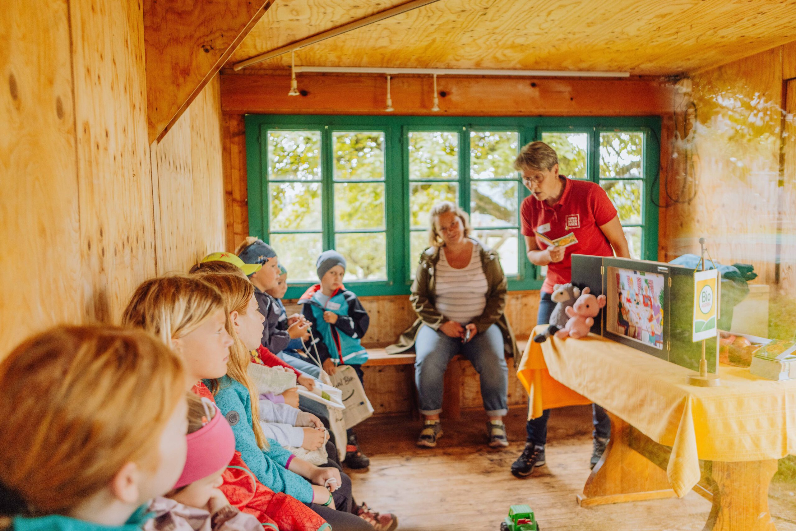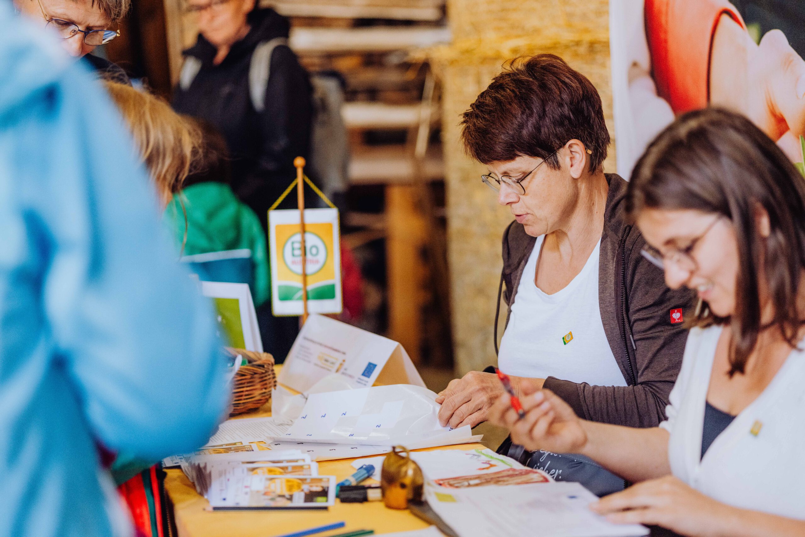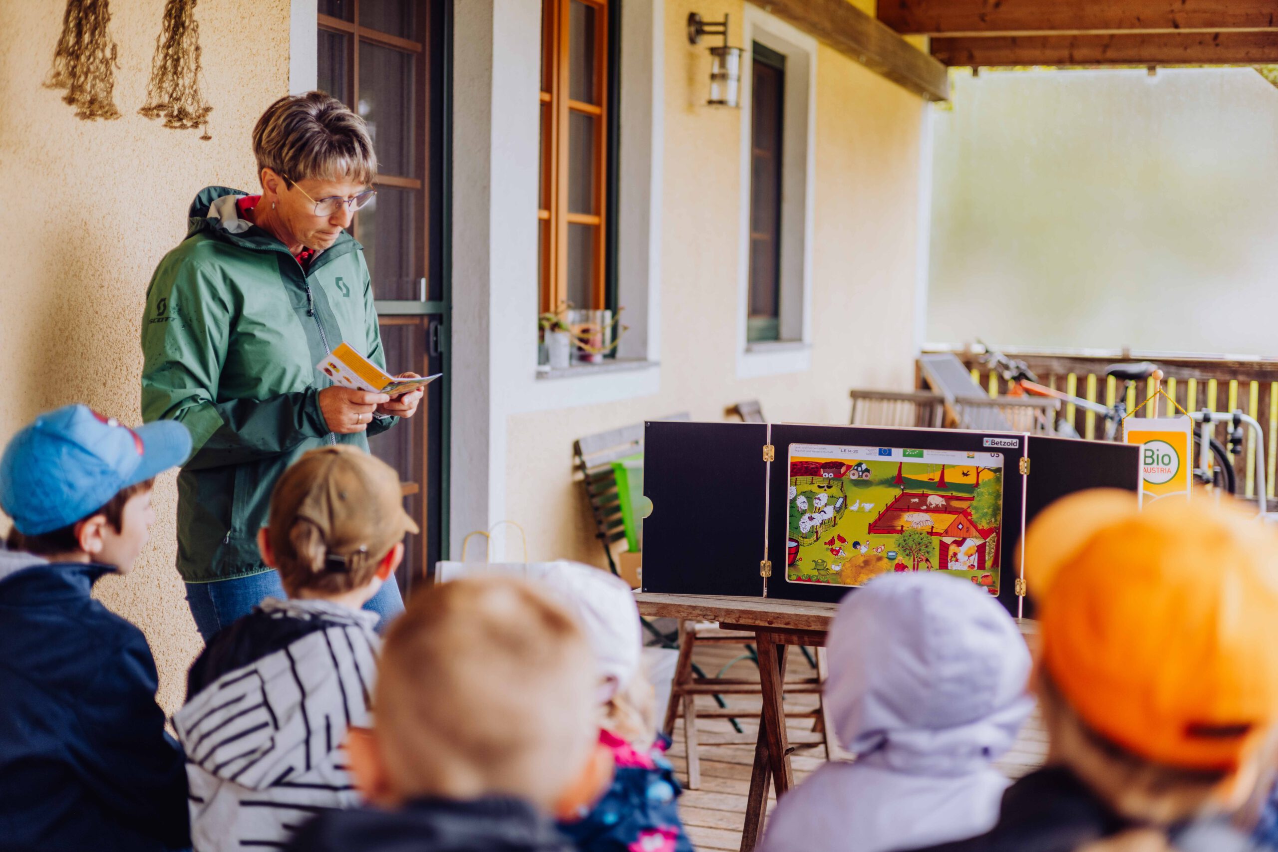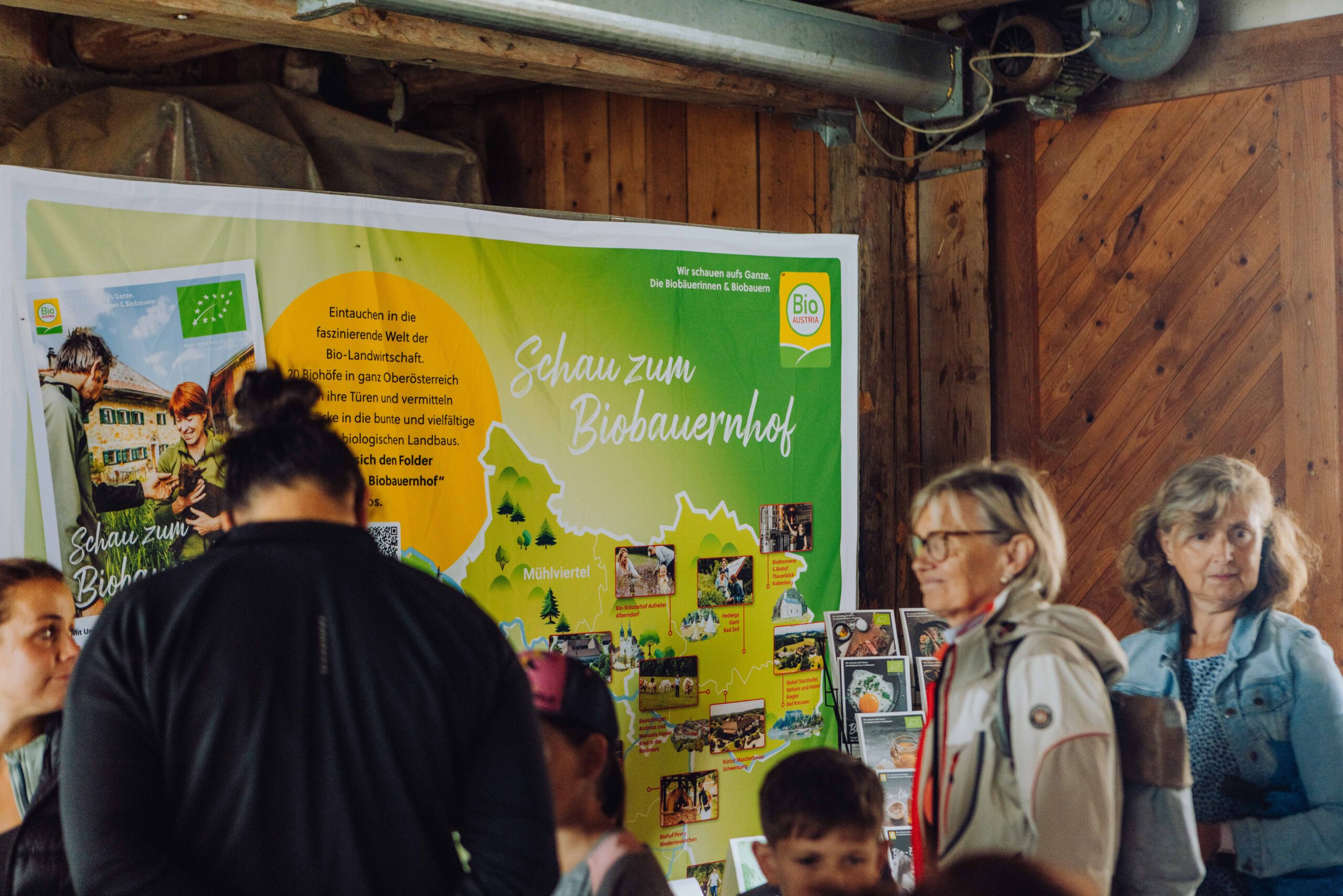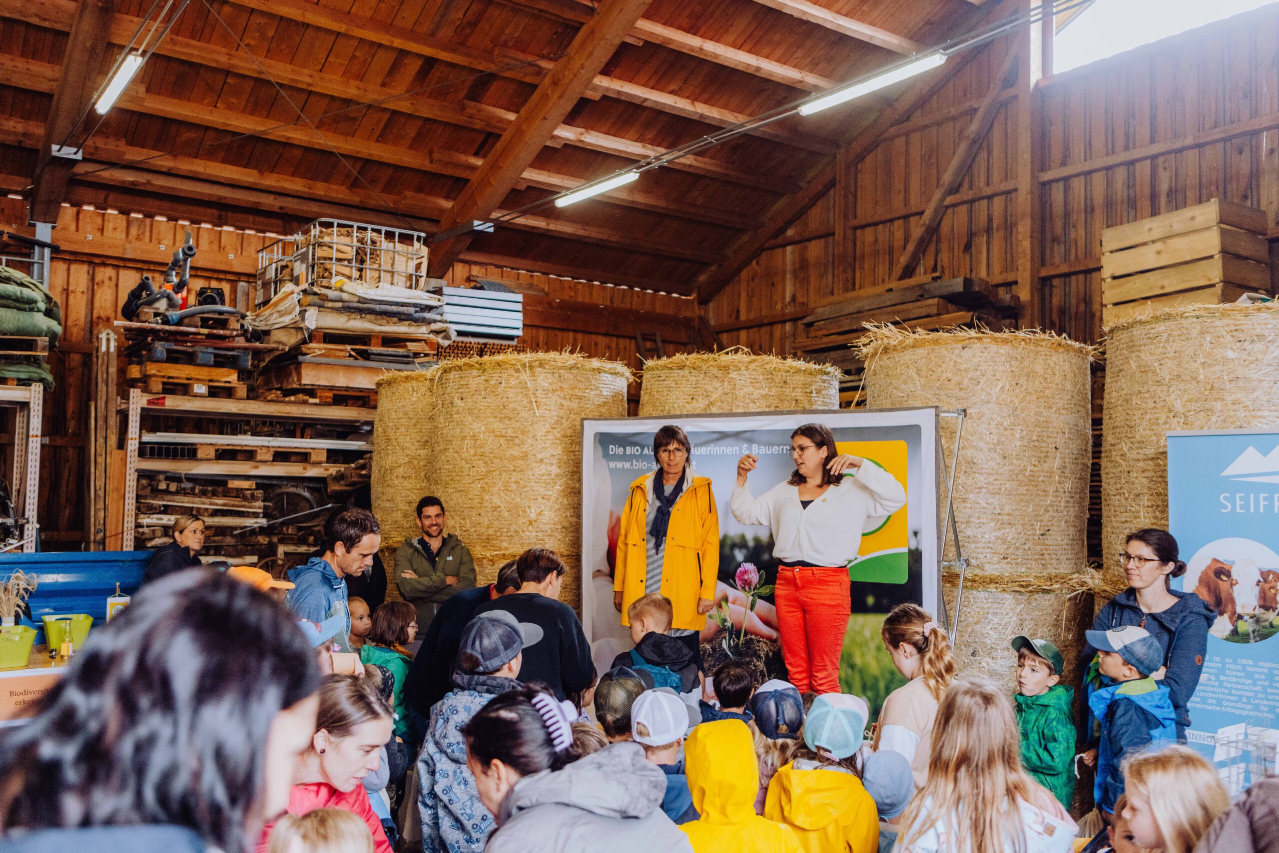 Ein besonderes Highlight waren die vier liebevoll gestalteten Mitmach-Stationen, die auf jedem Biohof für ein abwechslungsreiches und kindgerechtes Erlebnis sorgten. Beim Mira & Maxi-Erzähltheater wurde die Geschichte aus dem Bilderbuch „Mira und Maxi am Bio-Bauernhof“ im „Holzfernseher“ lebendig – begleitet von einer Bio-Seminarbäuerin und interaktiv erzählt. Bei einer weiteren Station drehte sich alles um das Thema Biodiversität. Mit tasten in „Greifsäcken“ und dem Formen von Samenbällen oder auch liebevoll „Pralinen für die Bienen“ genannt, wurde das Thema anschaulich vermittelt.