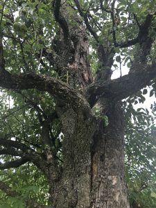Der Baum trägt in seinem Lebenswillen sogar Früchte. Der Stamm ist hohl. In ihm scheint es rund zu gehen, wie die nach außen verfrachtete Menge an morschem Gewebe, gemischt mit kleintierischen Hinterlassenschaften verrät. Dieser Baum ist ein Gigant. Wie er hier steht, den Jahrzehnten, Wind und Wetter trotzt, und einer Unzahl von Lebewesen Heimat und Schutz bietet. Niemals, so bleibt innerlich das Gefühl, niemals sollte er von hier verschwinden.