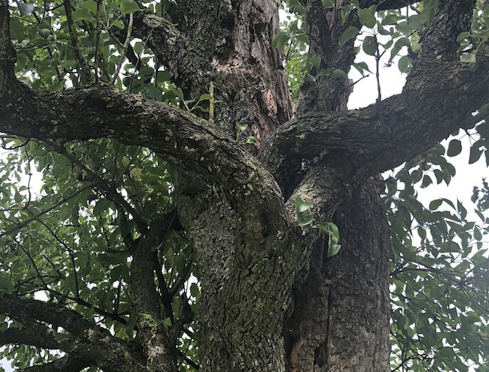 Am Königsberg in St. Georgen im Salzburger Flachgau auf dem Betrieb von Marianne und Robert Bandzauner steht ein bemerkenswerter Birnbaum. Eine Stammhälfte scheint tot zu sein, die andere hängt noch irgendwie am eigenen Leben. Der Blick steigt dem Stamm entlang ins Geäst und nimmt eine innige Umarmung wahr – die lebende und die bereits abgestorbene Baumhälfte will die jeweils andere nicht loslassen. Schön, dass da niemand mit der Motorsäge dazwischengefahren ist.