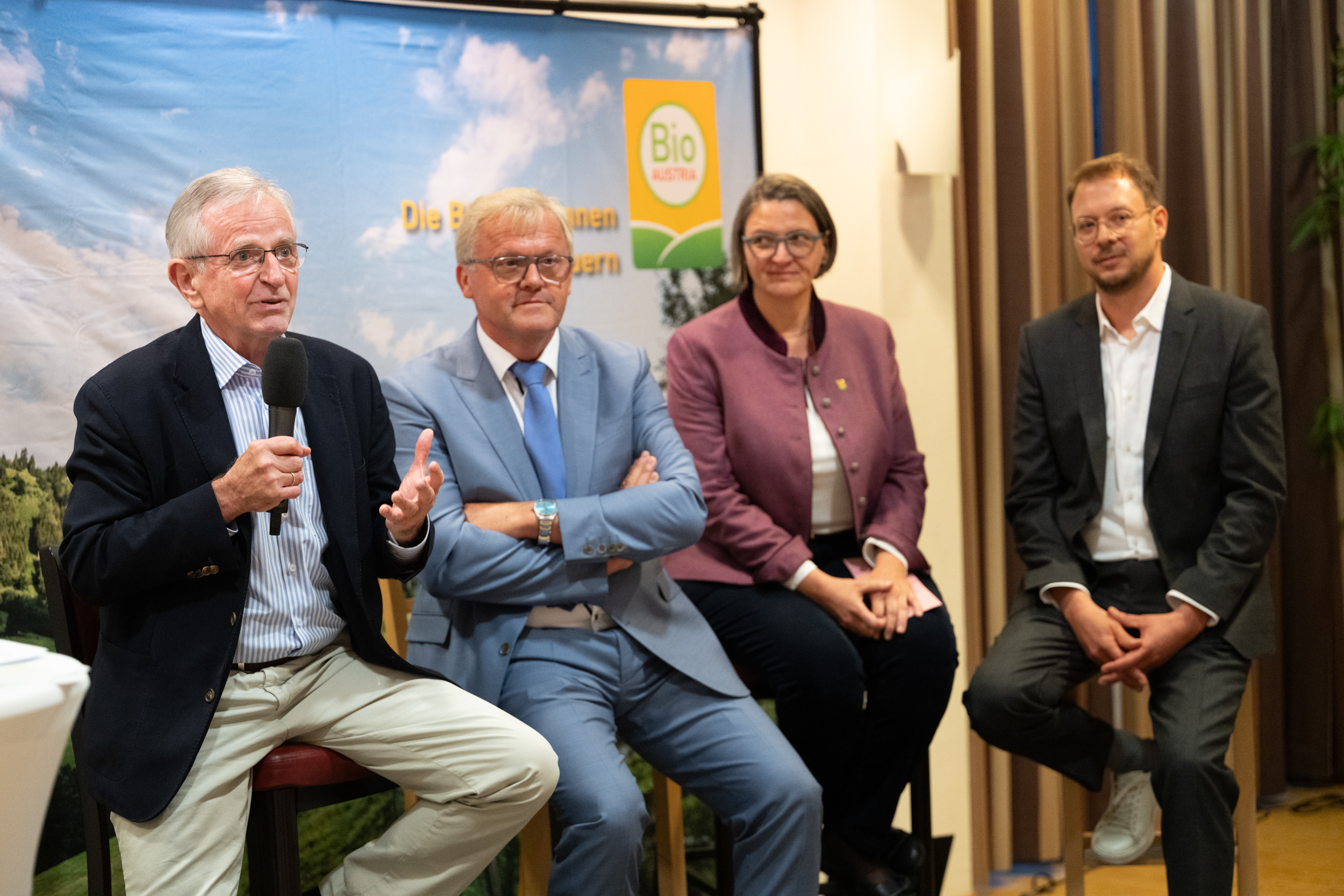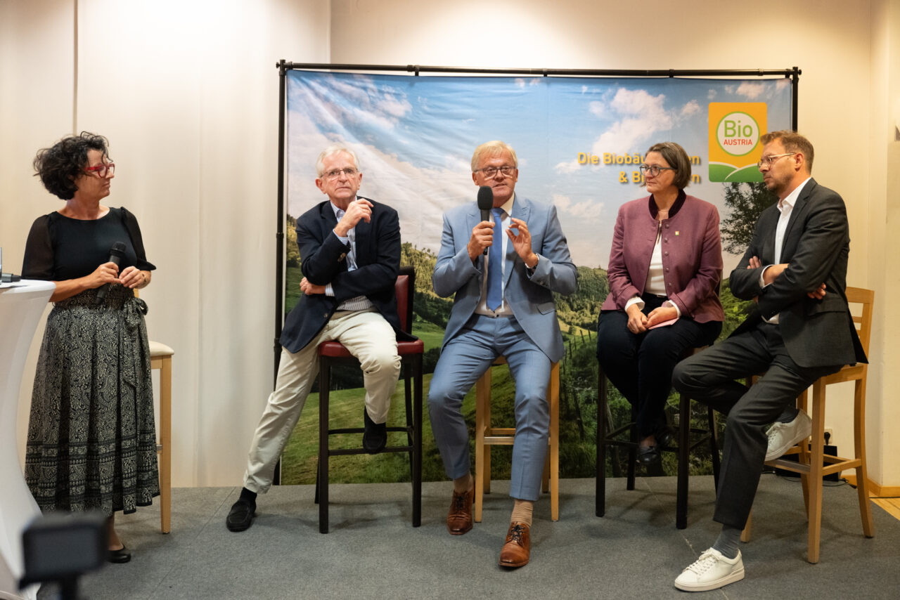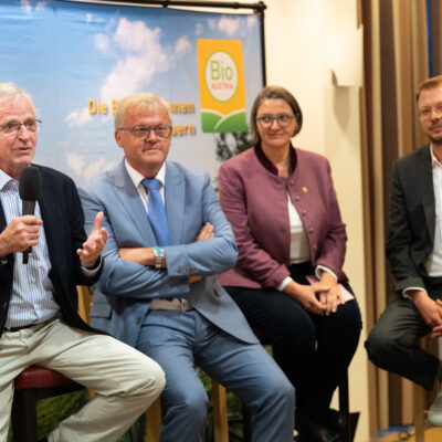 Ein besonderes Highlight waren die Podiumsgäste, die Vergangenheit, Gegenwart und Zukunft der Biolandwirtschaft in den Blick nahmen. Mit dabei waren Wilhelm Molterer, Landwirtschaftsminister zur Zeit der Gründung, Hannes Tomic, Gründungsobmann von BIO AUSTRIA, unsere aktuelle Obfrau Barbara Riegler sowie Tobias Metzler, Geschäftsführer der Werner Lampert Beratungsges.m.b.H. – ein spannendes Gespräch zwischen Gründergeist, Gegenwartsfragen und Zukunftsvisionen.