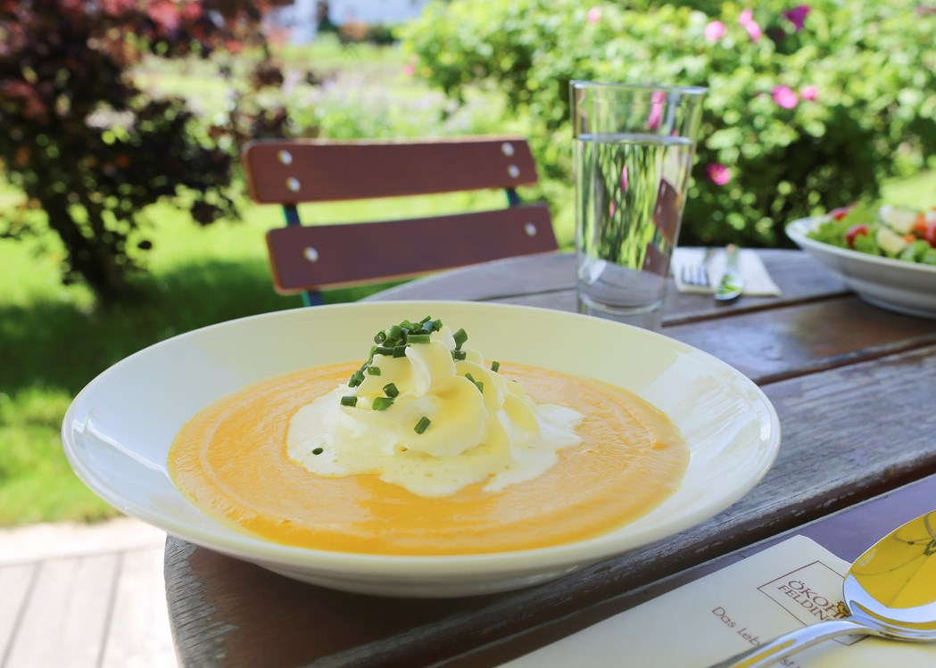 Einfach gut essen mit allem was dazu gehört, Suppe, Salat und Nachtisch sind bei jeder Mahlzeit selbstverständlich dabei. Das besondere Plus: Vieles kommt von den eigenen Bio-Äckern. Darüber hinaus wird eng mit regionalen Bio-Betrieben kooperiert. LiebhaberInnen von hochqualitativem Fleisch kommen auch auf ihre Kosten: Denn in der Speisekarte lassen sich verschiedene Fleischgerichte von Tieren aus heimscher artgerechter Bio-Haltung finden.