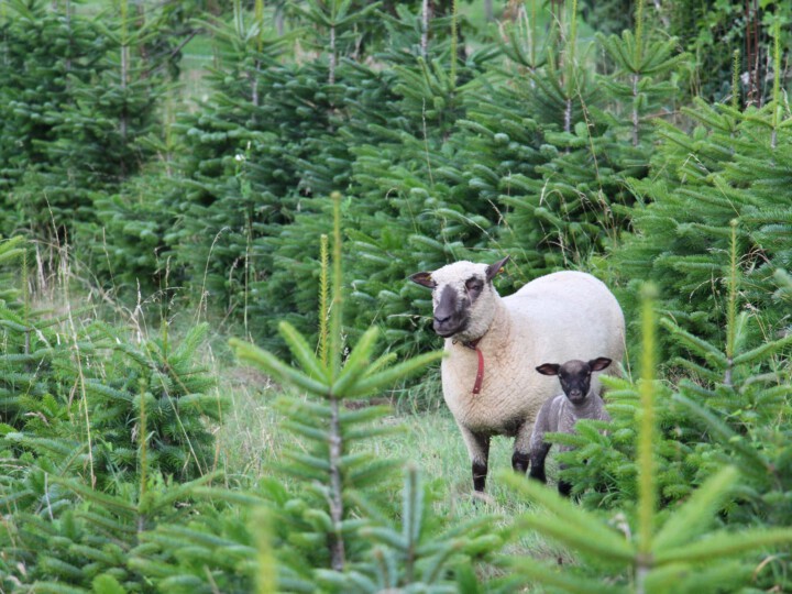 Zwischen Tannen und Fichten halten die Schafe die Wiese und Beikräuter niedrig. Neben der Zeitersparnis durch Entfall des häufigen Mähens düngen die Schafe gleichzeitig die Kultur. In Kombination mit stickstoffbindenden Pflanzen wie Klee in den Wiesen ist kaum zusätzlicher Dünger notwendig.