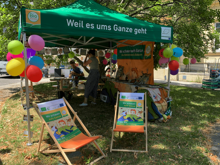 Der Informationsstand von BIO AUSTRIA, der dieses Mal besonders lauschig unter einem großen, Schatten spendenden Baum im Garten des Areals aufgebaut war, bot zahlreiche spannende Informationsmaterialien wie Rezeptkarten und Broschüren rund um die Vorzüge von Produkten aus biologischem Anbau. Infobiobäuerinnen und Infobiobauern erklärten interessierten Personen, wie BIO AUSTRIA Bäuerinnen und Bauern im Einklang mit der Natur wirtschaften und dabei besonders auf den Schutz der Lebensgrundlagen Wasser, Boden und Luft achten.