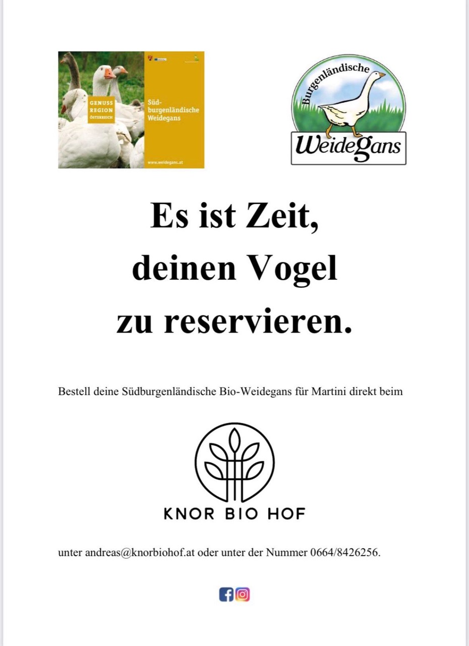 Bestell deine südburgenländische Weidegans für Martini direkt beim Knor Bio Hof!