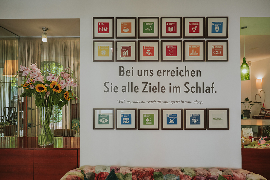 Inspiriert von den 17 Nachhaltigkeitszielen dreht sich im Boutique Hotel Stadthalle alles um die Nachhaltigkeit. Der besondere Stolz des naturnahen Betriebes: die Null-Energie-Bilanz. Der gesamte Energiebedarf wird durch hauseigene erneuerbare Energiequellen und Energiesparung gedeckt. In einer Auswahl von 80 gemütlichen Zimmern, in denen Nachhaltigkeit in Form von Upcycling und der Liebe zum Detail gelebt wird, ist garantiert für jeden Gast das passende Bett dabei. Ein idyllischer Innenhof bringt die erholsame Natur in die Großstadt. Im Boutique Hotel Stadthalle geht die Liebe zur Nachhaltigkeit auch durch den Magen, denn das herrliche Bio Genuss-Frühstück lässt keine Wünsche offen. Die große Auswahl an Buffet-Leckereien stehen den Hotelgästen aber auch externen Gästen zur Verfügung.
