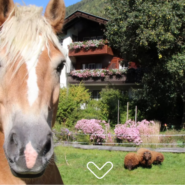 Kaninchen, Katzen, Enten und Meerschweinchen sind mit ihrem Nachwuchs rund um unser Haus unterwegs. Unsere Pferde Amigo, Jara, Jaro und Tinkerbell mit ihrem Fohlen Tira warten schon aufs Reiten. Die kuscheligsten Tiere am Hof sind unsere Berner Sennenhunde Bella und Cookie. Sie lieben es, mit Kindern zu spielen und herumzutollen.
