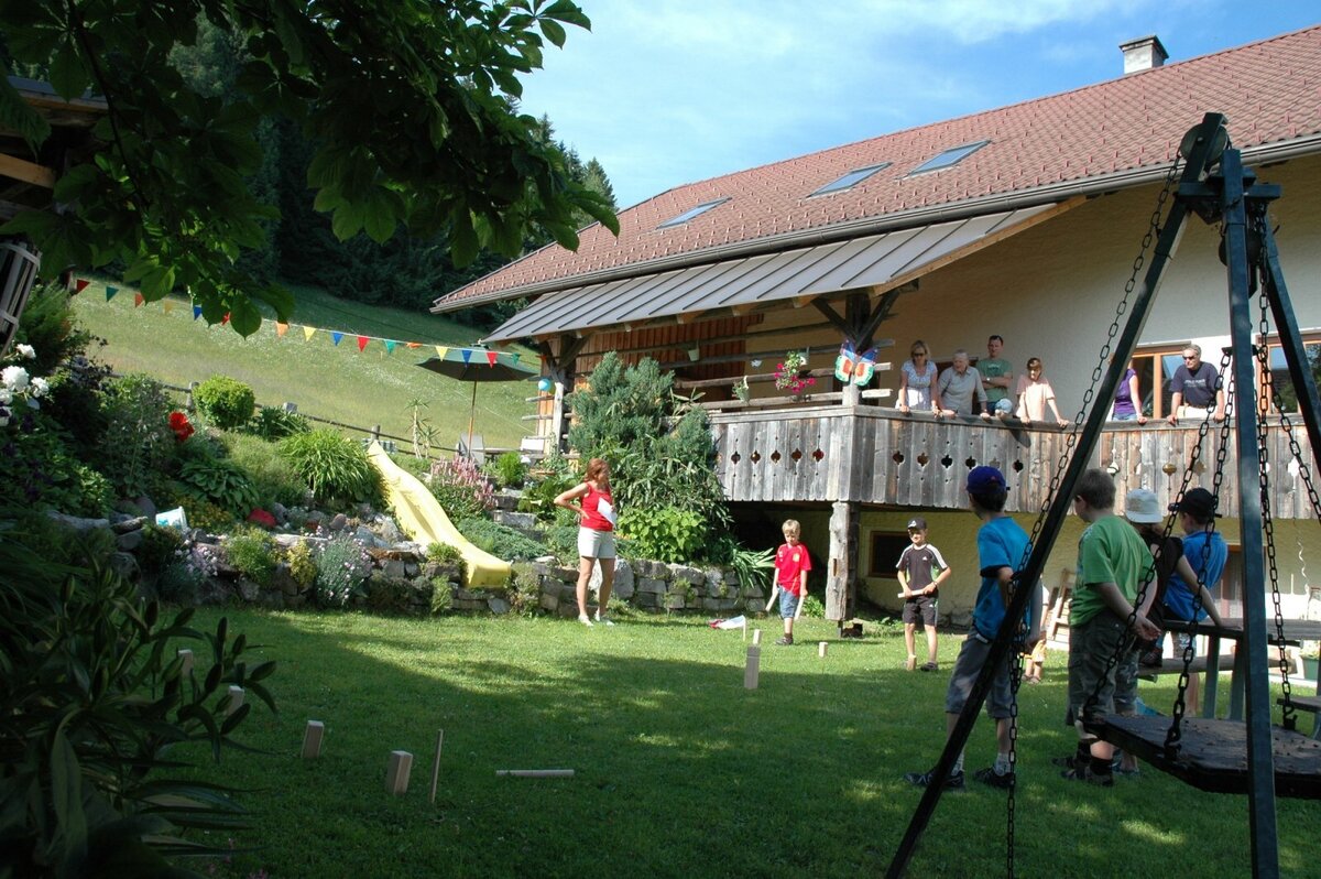 Katzen streicheln und Kälbchen füttern, Eier einsammeln, sich um die Ponys kümmern, ihre seidigen Mähnen bürsten, beim Ausmisten helfen, ausreiten oder die Zwergziegen streicheln und mit ihnen den Goldberg erkunden. In der großen Holzwerkstätte wird gebastelt, gesägt geschliffen und gehämmert. Nach den Erlebnissen des Tages ist der große Garten mit Steingrill ein beliebter Treffpunkt für Jung und Alt.