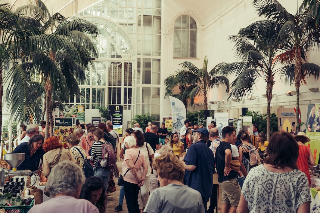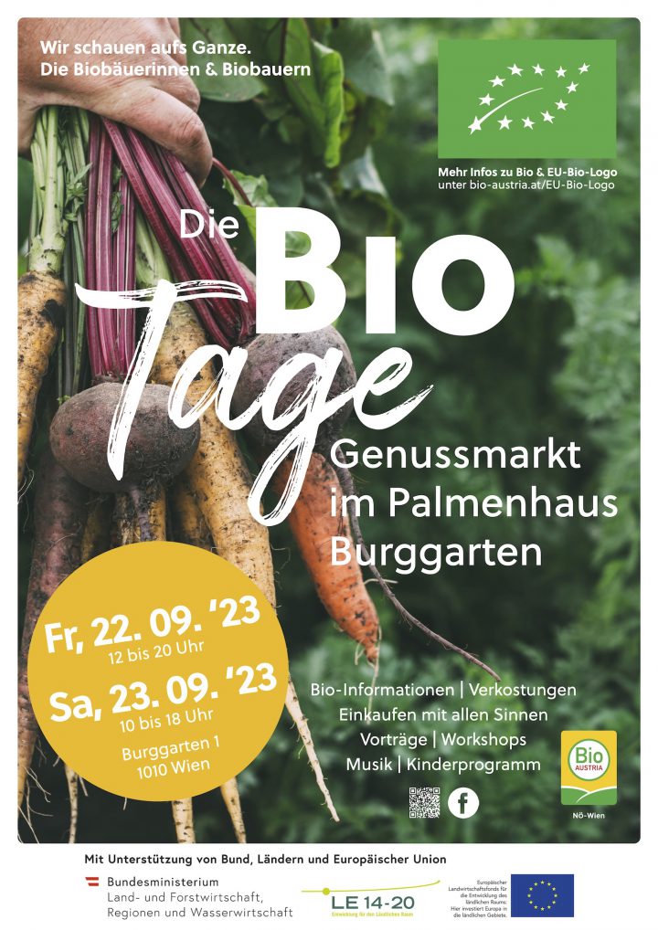 Die BIO Tage – Genussmarkt im Palmenhaus werden unterstützt von Bund, Ländern und der Europäischen Union. (Entwicklung für den ländlichen Raum: LE 14-20 sowie Europäischer Landwirtschaftsfonds für die Entwicklung des ländlichen Raums: Hier investiert Europa in die ländlichen Gebiete: ELER).