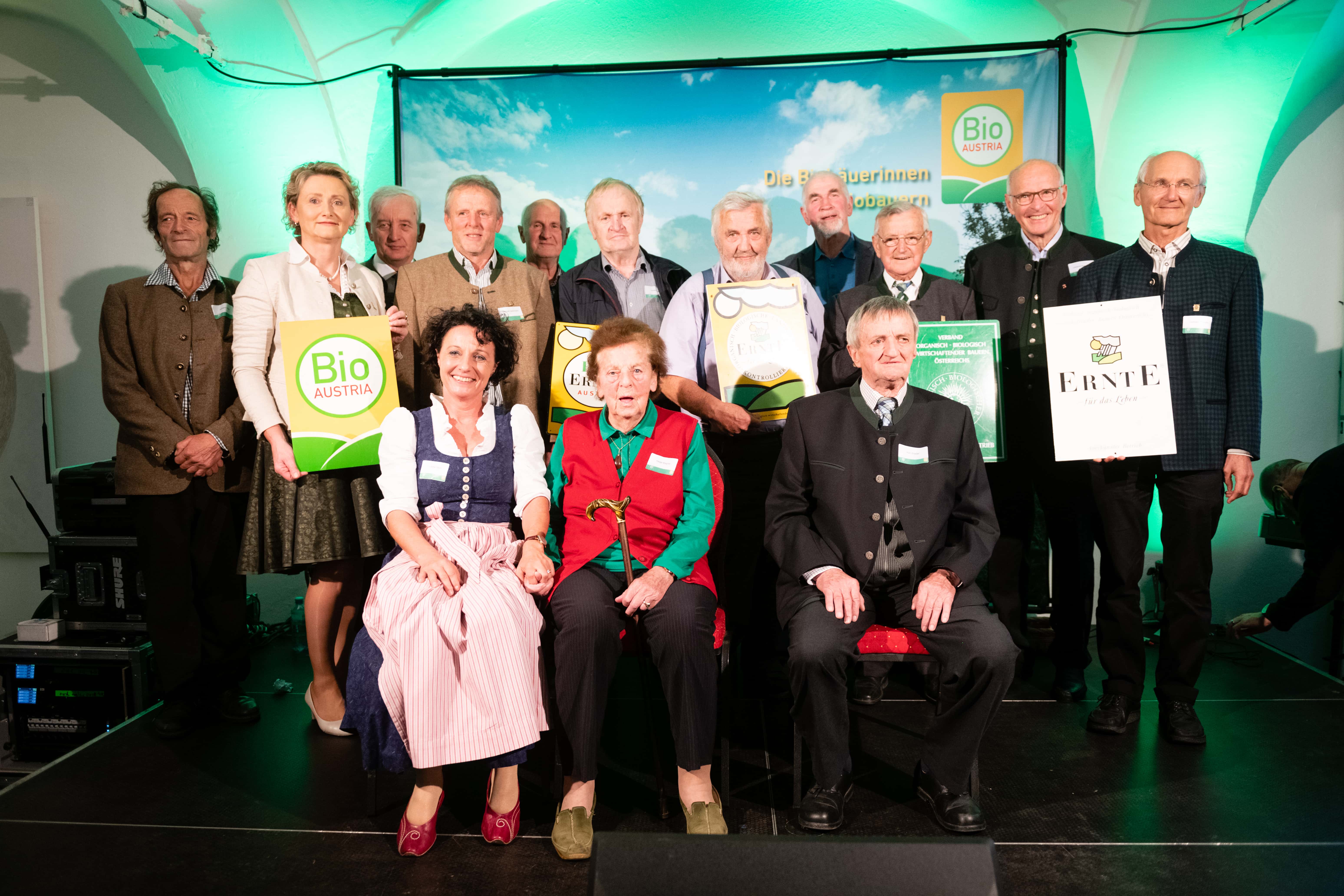 BIO AUSTRIA Obfrau Gertraud Grabmann (2.vl.) und BIO AUSTRIA Geschäftsführerin DI Susanne Maier (sitzend, 1.vl.) mit Bio-Pionierinnen und Bio-Pionieren bzw. Gründungsmitgliedern des ersten Bio-Verbandes 1979