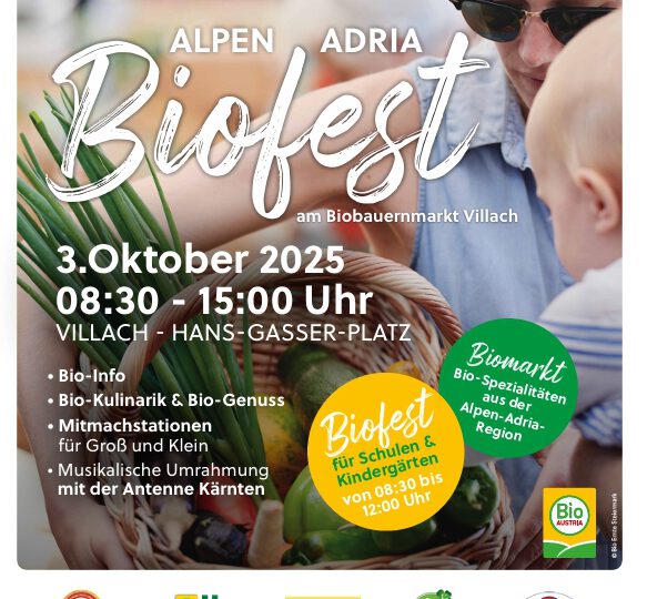 Ein besonderes Highlight: der Biomarkt mit Spezialitäten aus der Alpen-Adria-Region. Für Schulen und Kindergärten gibt es von 08:30 bis 12:00 Uhr ein eigenes Biofest-Programm.