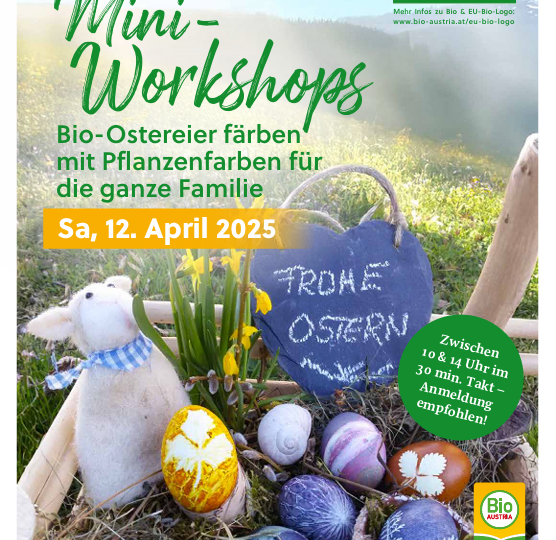 In den Mini-Workshops erfahren die Teilnehmenden, wie man Ostereier mit natürlichen Säften aus Gemüse und Gewürzen färbt und dabei ganz individuelle, biologisch essbare Kunstwerke schafft. Es wird experimentiert, welche Farbnuancen mit Pflanzenfarben entstehen und wie man Ostereier kreativ verziert. Zudem gibt es interessante Infos zur artgerechten Hühnerhaltung im Bio-Landbau und zu Bio-Eiern.