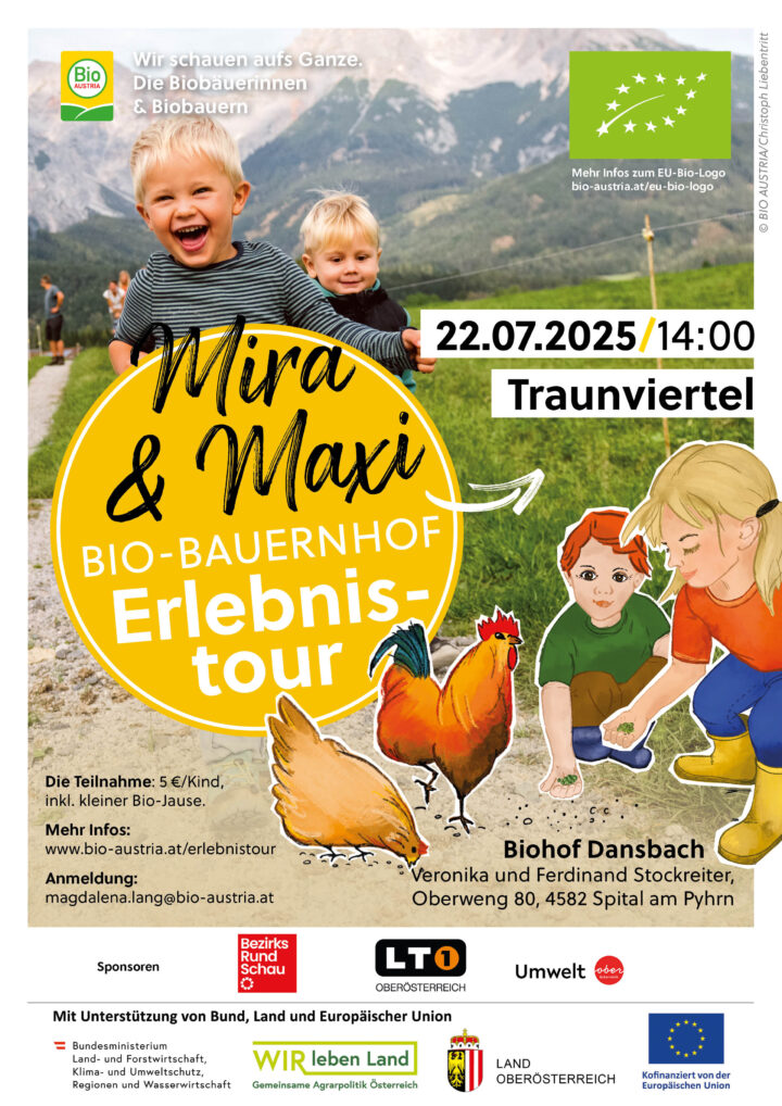 Am 22. Juli erwartet euch ein erlebnisreicher Tag am Biohof Dansbach in Spital am Pyhrn. Gemeinsam gehen wir uns auf eine Entdeckungstour – vom Kalb bis zur Milchkuh – und erfahren was die Bio-Haltung so besonders macht. Doch damit ist genug! Die Hasen, Katzen und Hühner am Hof gehören gefüttert und die kleinen Kälber freuen sich schon auf Streicheleinheiten. Frische Bio-Milch direkt vom Hof und den daraus hergestellten leckeren Bio-Käse gibt es natürlich für euch zum Verkosten!
